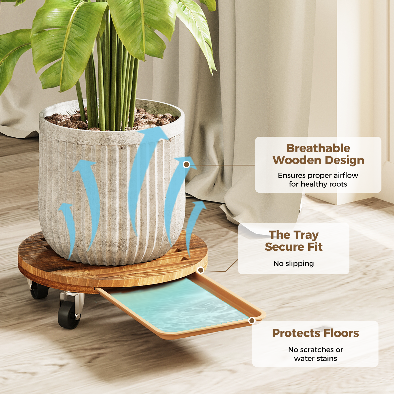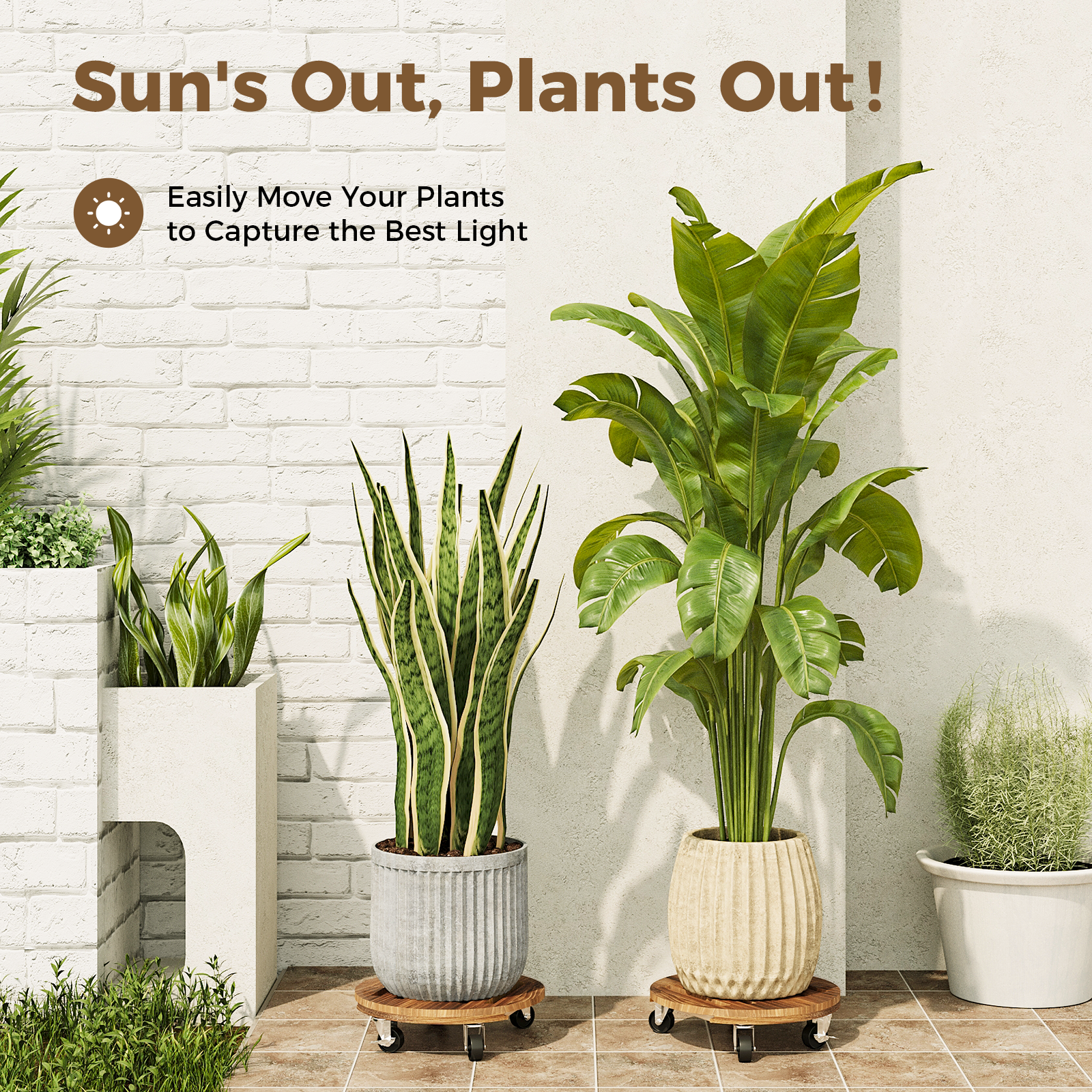 Bamworld Rolling Plant Stands with Wheels Plant Caddy with Wheels Planter Stand 12 Inch Pot Stand 2 Pack Plant Dolly with Drainage Tray Durable Wooden Design for Indoor Outdoor